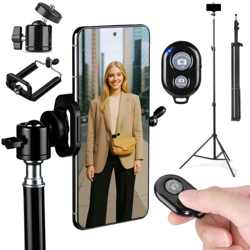 Dołączony uchwyt na telefon i pilot Bluetooth ułatwiają nagrywanie bez dotykania urządzenia. Lekka, aluminiowa konstrukcja i szeroki zakres regulacji wysokości sprawiają, że to idealny wybór do domu, studia i w plener.